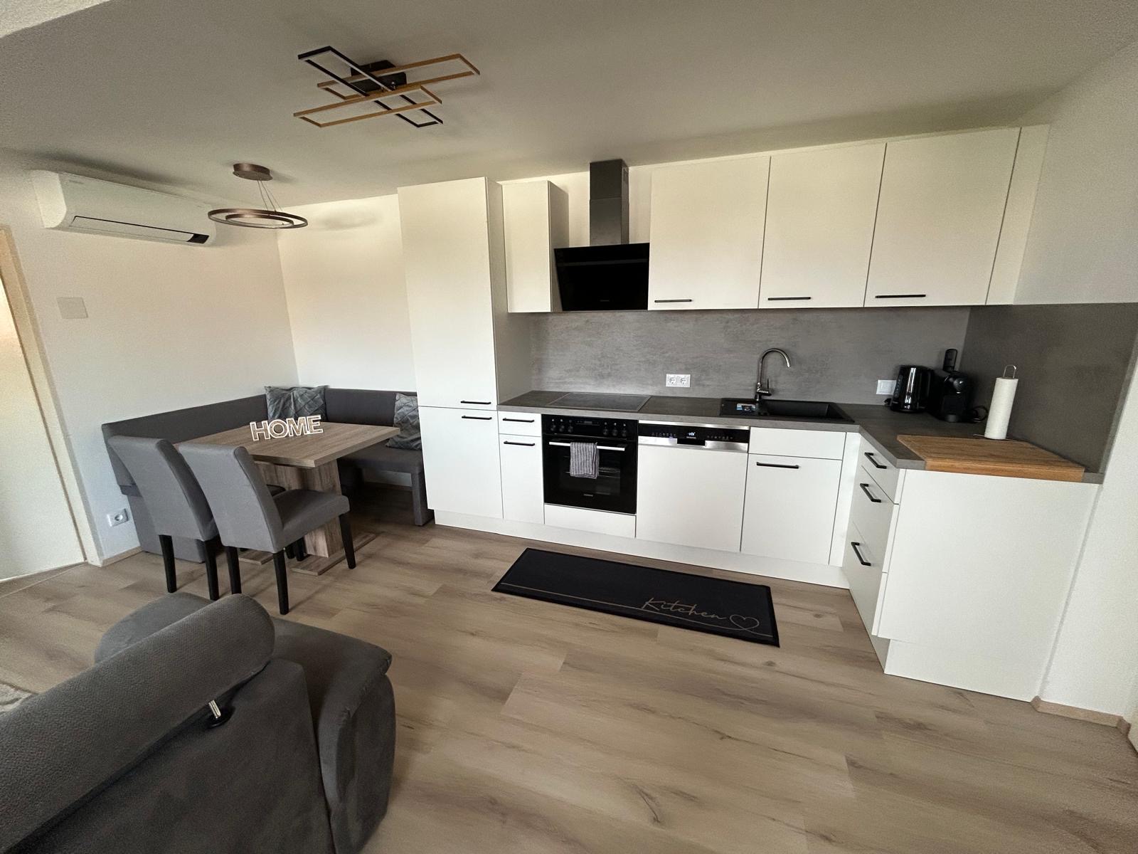 Die private Küche im Apartment umfasst Kühlschrank, Gefrierfach, Backrohr, Kochfeld, Kaffeemaschine, Wasserkocher sowie zahlreiche Extras.